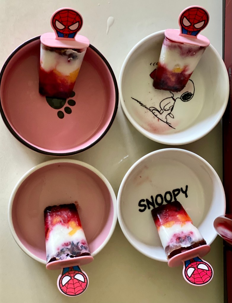 Chop all the fruits finely, and then put them in layers in the popsicle molds. This is how we have our layers, watermelon 🍉, mango 🥭, cottage cheese , blueberry 🫐, and strawberry 🍓. Freeze in in the refrigerator for about 2 hour and its reDy for us to eat 🐶🐶🐶🐶.