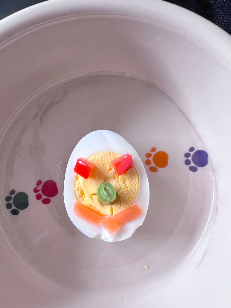 Now this is very easy and yummy!!! Half a boiled egg π₯ green beans nose , red bell pepper eyes π, and carrot π₯ smile. thats all to make is fur babies πΆπΆπΆ happy.