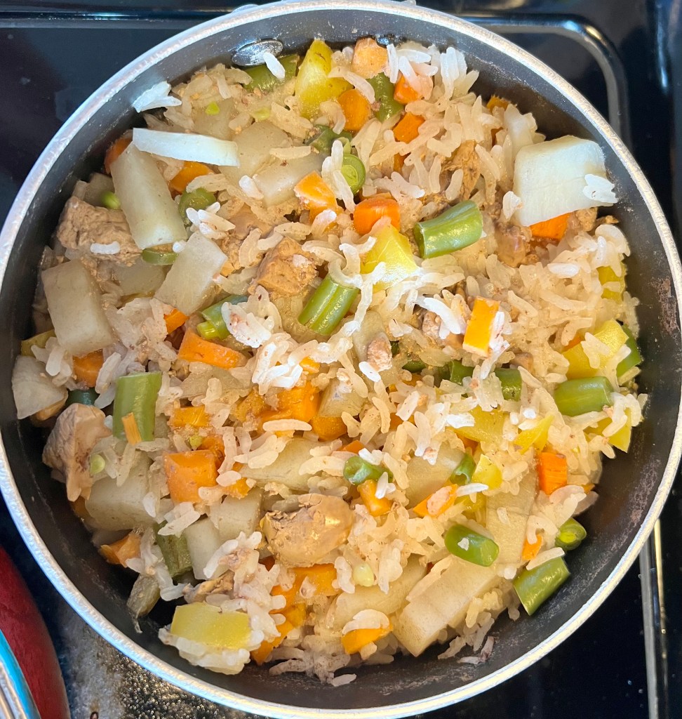 Mommy cooked for us today and it was yummy 😋. It was rice with organic veggies and liver, she does add 1/2 teaspoon of olive oil to it